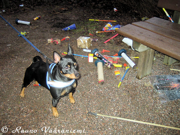 Uutena vuotena jätin ylensyömisen ja keskityin vain lepäilemiseen. Kävimme alkuillasta ulkona haistelemassa ruudinkäryä ja kusisia heiniä, kuten isäntä asian ilmaisi. Hei, ei niihin heiniin ole kukaan välttämättä kussut, niissähän voi olla muuten vain ihanan narttukoiran sulotuoksu. En viitsinyt alkaa tuosta väittelemään, sillä ihmisen nenähän on tunnetusti ihan yhtä herkkä hajuille kuin puinen ovenkahva.