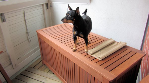 Ja lopuksi vielä uuden asunnon sisustamisesta. Meillä on matot lattioilla eikä niitä tarvitse pitää, ne pysyvät ihan itse. Tuo oli kuuluisaa kääpiöpinsereiden hauhuumoria, eli hauhuuta. Saa nauraa ihan vapaasti. Teimme asunnolla kaikenlaisia hommia, viimeisimpänä parvekkeelle tulevan säilytysarkun kasaaminen. Minä valvoin, että siitä tuli hyvä. Välillä tosin pelasimme palloa, sekin minun vaatimuksesta. Ei pidä tekemän työtä ilman leikkitaukoja, se on yksi kääpiöpinsereiden motoista.
