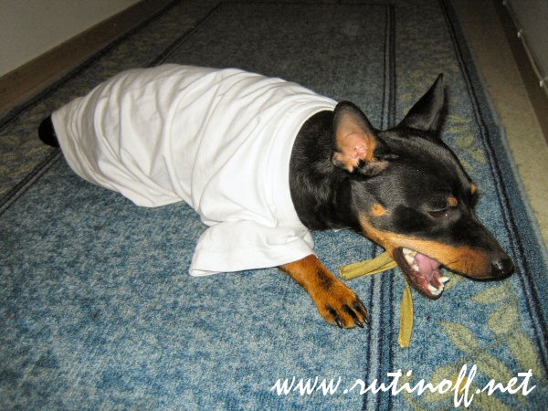 Käytättehän tekin pyjamaa, kuten kunnon nukkujan tulee tehdä? Tässä se meikäkoira vetelee iltapalaa tyytyväisenä ja