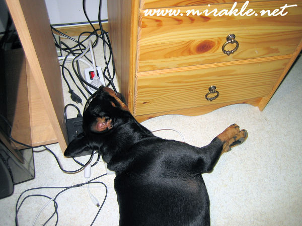 Lopuksi vähän taustatietoja tuohon tämänkertaiseen kuvaan: Suurin osa varmaan tietää, että meillä kääpiöpinsereillä riittää virtaa aamusta iltaan ja sitä rataa, ihan kuin miljuunalla turasellipupulla. No, se niistä pupuista, slurpsis. Joo, mutta mistä se virta sitten tulee? Paljastan tässä erään tarkoin varjellun salaisuuden, josta ei saa hiiskua kenellekään ulkopuoliselle. Me kääpiöpinserit lataamme itseämme aina silloin tällöin. Se onnistuu todella kätevästi vaikka nukkumalla pistorasian päällä.
