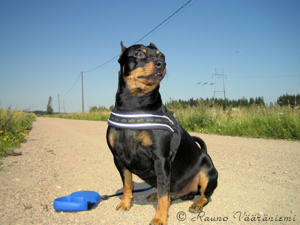 Huomaatteko muuten miten kiltti olen? Tässäkin kuvassa istun flexi vierelläni, eikä kukaan pidä siitä kiinni. Olisin voinut käytännössä kirmaista vaikka pellon poikki Lahteen, mutta enpä viitsinyt isäntää rienata moisella koiruudella. Lahteen sen takia, että olimme Villähteellä ukin ja mummon naapureita haukkumassa. Homma meni kylläkin niin, että minä haukuin naapurit ja isäntä minut, höhhau!
