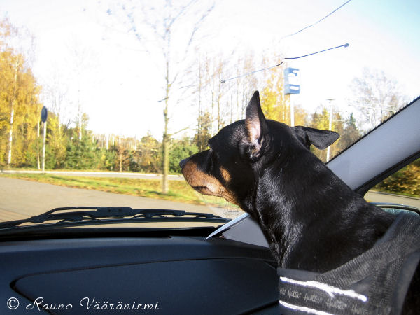 Jos totta haukutaan, niin en minä yleensä matkusta noin etupenkillä. Auto oli vain niin täynnä tavaraa, että minulla oli kaksi vaihtoehtoa – olla apparin sylissä tai juosta perässä. Valitsin etupenkin, sillä naisen sylissä on aina kiva olla.