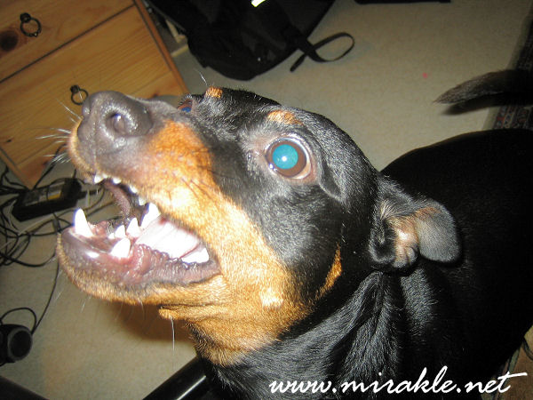 Tarkoitukseni ei ollut suinkaan pelotella ketään, vaan esitellä tätä meikähaukun verratonta purukalustoa. Kyseinen kuva on otettu samalla kun leikin isännän kanssa eräällä lelulla, jota en ole saanut rikki millään. Pyhhau, että toiset lelut osaavatkin olla ehjiä vuodesta toiseen. Tuollainen kestävyys suorastaan masentaa kääpiöpinseriä, ihan sinne hännän viimeiseen karvaan asti.