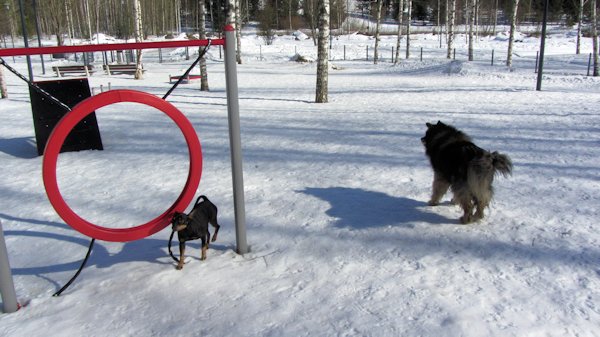 Täällä Vantaalla me olemme Miron kanssa käyneet tsekkaamassa paikat Korson ja Rekolan koirapuistoissa, joista tämänkertaiset kuvat ovat otettu. Rekolassa meillä oli kovat treenit Miron emännän johdolla. Minustakin tulisi agilitykoira jos haluaisin, mutta kun en halua. Haluan olla sohvaperuna, se kun sopii kropalle paremmin kuin joku keppien kiertäminen tai hyppiminen.