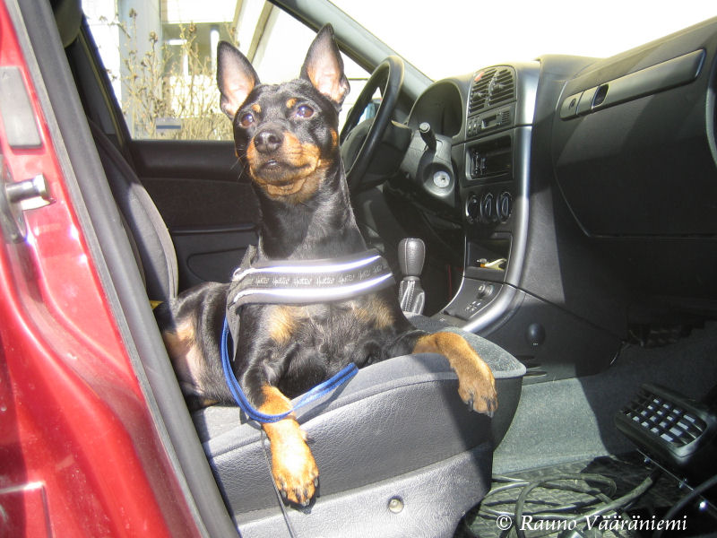 Ensin pari sanaa tästä apumiehen paikalta. Ollaan siellä liikenteessä varuillaan eikä ajella simoissa. Juotte vain vettä, kuten minä, niin kaikki pääsevät ehjinä kotiin koiriaan rapsuttelemaan. Sitten ne koirat laitetaan kiinni autoissa. En minäkään matkusta etupenkillä, vaikka oma mieli siihen suuntaan olisikin. Isäntä kertoi nähneensä jokunen viikko takaperin erään kääpiöpinserin henkilöauton hattuhyllyllä, huhhau! Meikäpoika on onneksi sen verran, köh, roteva, etten millekään hattuhyllylle edes mahdu.