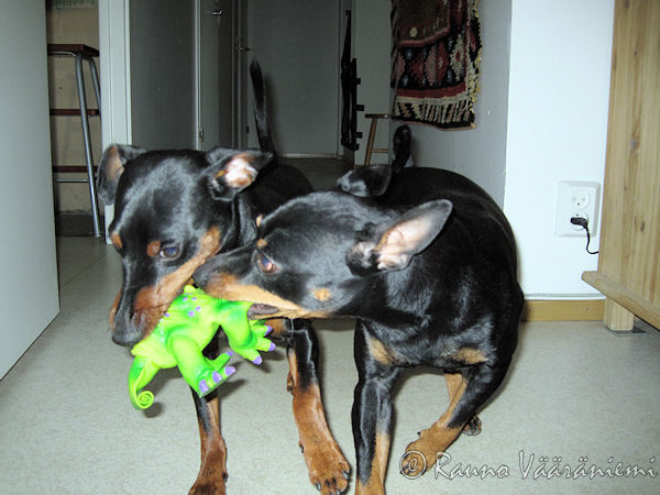 Lahjalla leikkimisen jälkeen pistimme isoveikkahaukku Lukan kanssa painiksi, oikein kunnon kääkkämylläyspainiksi. Isäntä yritti ottaa kuvia meistä, mutta joko se tai kamera on hidas, eli ei siitä oikein mitään tullut. Kattokaa nyt tuotakin yläpuolella olevaa kuvaa, mitä siitä saa selvää? Vähän vois kyllä toivoa rispektiä toisen synttärikuvien suhteen, eikä sihtailla minne sattuu, viuvähpah!