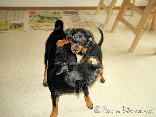 Olen yrittänyt opettaa Krisiä haukkumaan Hesarille ja päiväpostille sekä ovikellon soitolle ja sisälle tuleville vieraille. Lisäksi olen korostanut, että kaikki pitää ottaa vastaan eteisessä, siis vieraita mennään vastaan eteiseen. No, tänään rapisi ovella ja meidän oman lauman jäsen tuli sisälle. Lähdimme Krisin kanssa rinta rinnan olohuoneesta ovelle katsomaan mikä siellä mekkaloi. Meitsihaukku veti häntä oikosena ovelle, kun taas pikkukääkkä kurvasikin sujuvasti makuuhuoneeseen ja meni siellä sängyn alle! Haukamoon, mitä siellä sängyn alla oikein tapahtui? Ei varmaan mitään, kun villakoiratkin oli mopattu aamulla pois, voi yhden haukerran mikä pentu!