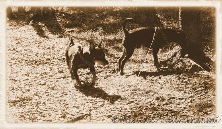 Metsässä olemme törmäilleet vaikka minkälaisiin kulkijoihin. Kesä saa kivien koloista esille mitä ihmeellisimpiä ihmetyksiä. Kerrankin yksi mies tuli sauvojen kanssa vastaan ja kysyi meiltä, että onko meitä käytetty työkoirina? Kris taisi veikata heti oikein, kun haukahti sedän olevan umpi savolainen, eihän muut täällä työstä puhu. Hmphhau, kyllähän me toisaalta töitä tehdään joka arkipäivä, vahdimme kotia.